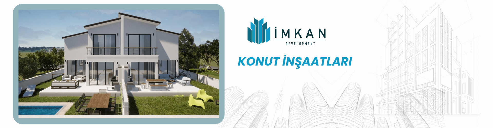 İmkan Development olarak, 4 farklı alanda uzmanlaşmış yüksek mimar ve mimar arkadaşlarımız ile konforlu, modern ve estetik konut projeleri inşa ediyoruz. Her bir projemizde, yenilikçi tasarımlar ve yüksek kaliteli yapılar sunarak, sakinlerine yaşam boyu konfor ve güvenlik sağlamayı amaçlıyoruz. Yaşam alanlarını en iyi şekilde tasarlıyor, her detayıyla ihtiyaçlarınıza en uygun çözümler üretiyoruz. Konut projelerimizde, yaşam kalitesini artıran tasarımlar ve sağlam yapılarla, İmkan Development imzası her zaman öne çıkıyor.